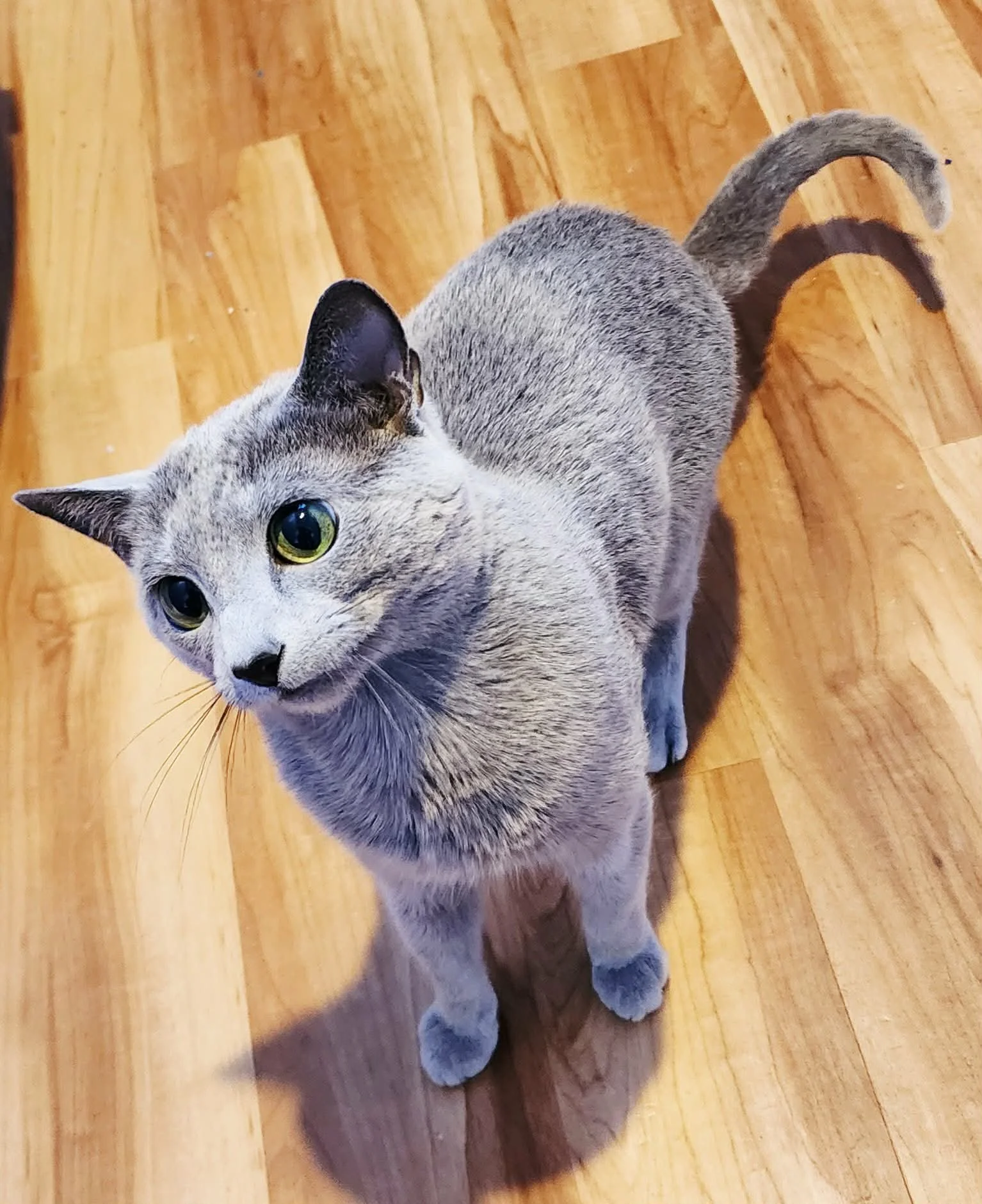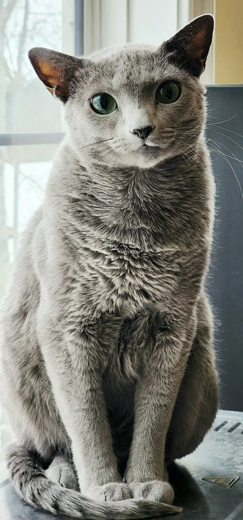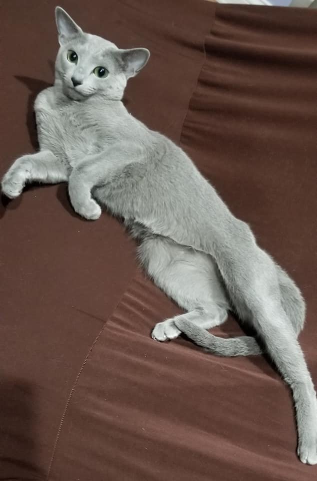 Palli is a bit smaller than average Russian Blue male, which we preferred for breeding here (to mate with one special top show girl, Bella, who stood out in show due to her longer and taller stature). He has beautiful emerald green eyes, is pale coated, and looks very young! Palli is neutered, microchipped, is up to date on all vaccinations, and is very healthy.